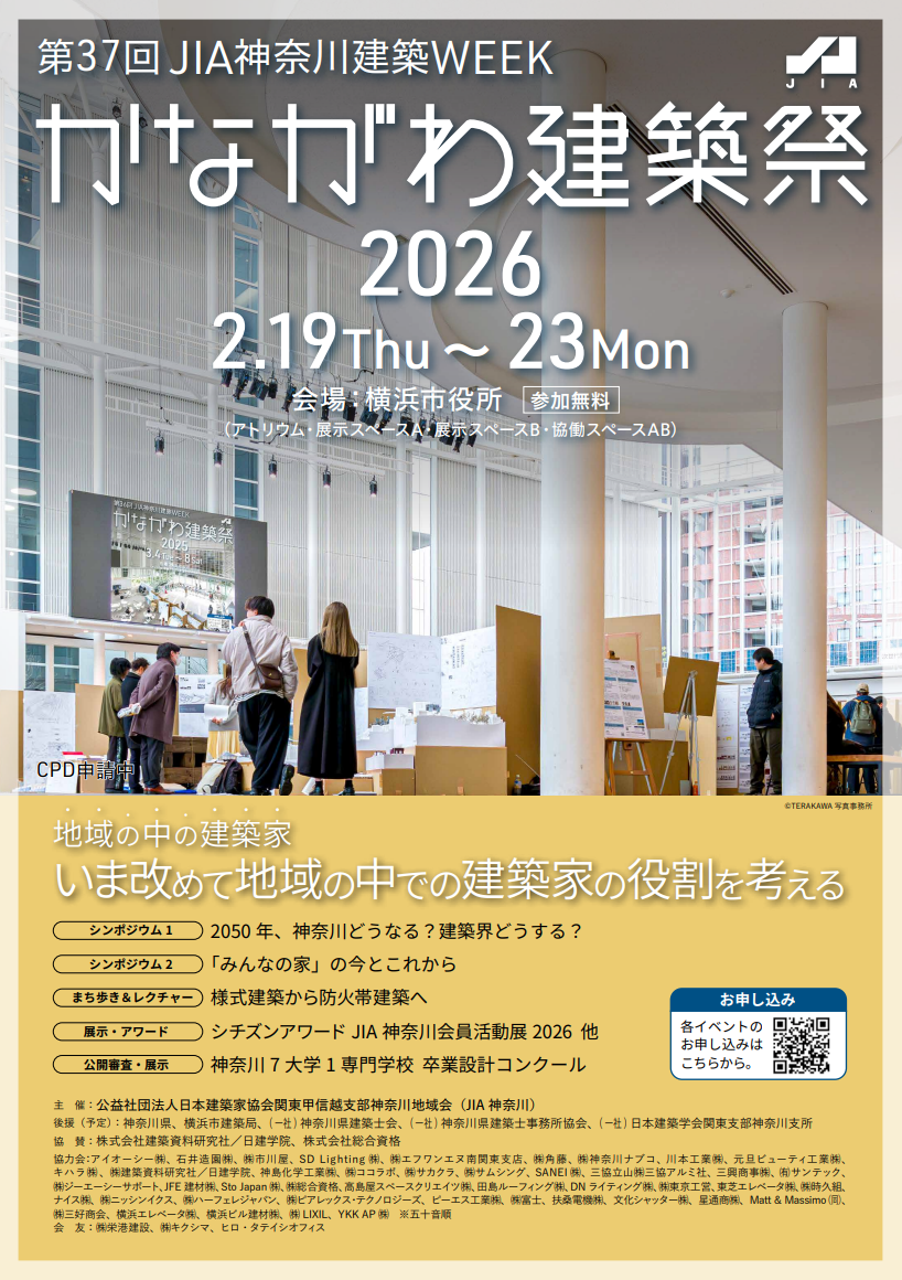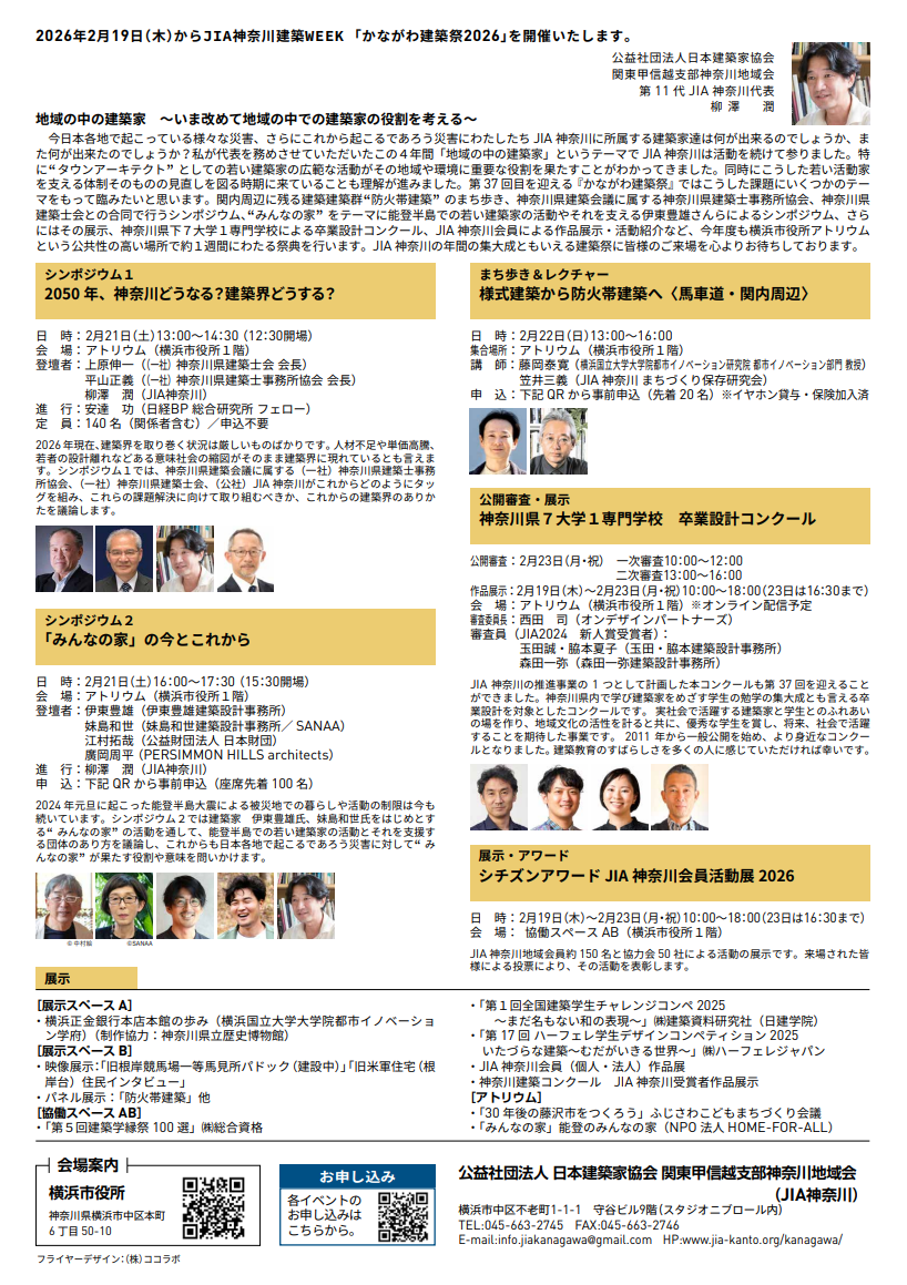 JIA神奈川が主催する「JIA神奈川建築WEEK かながわ建築祭 2026」のなかで、「みんなの家」についてのシンポジウムと、「能登のみんなの家」の展示が行われます。そのほかにも盛り沢山のプログラムが用意されますので、ぜひ横浜市役所までおでかけください。